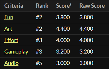 My game ranked 2nd in fun and art. Here are the results: